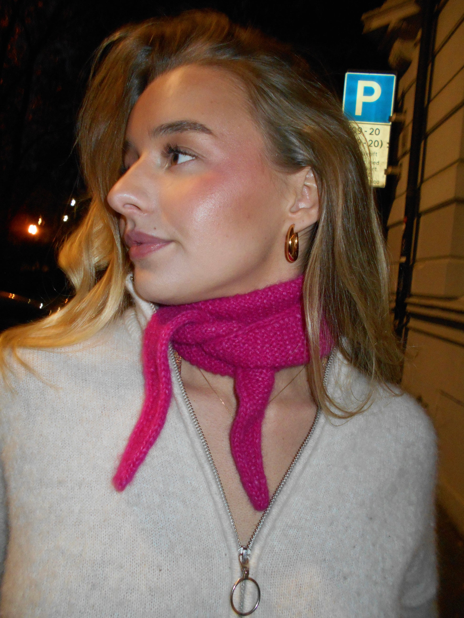 Skjerfene har en smal form og en lengde som gjør at de kan brukes på flere måter. Du kan knyte dem én gang rundt halsen, la endene henge ned, eller stramme litt for å få et tydeligere uttrykk. De passer fint både når du bare vil ha noe rundt halsen inne, eller under en jakke ute. Håndstrikket i alpakkaull.