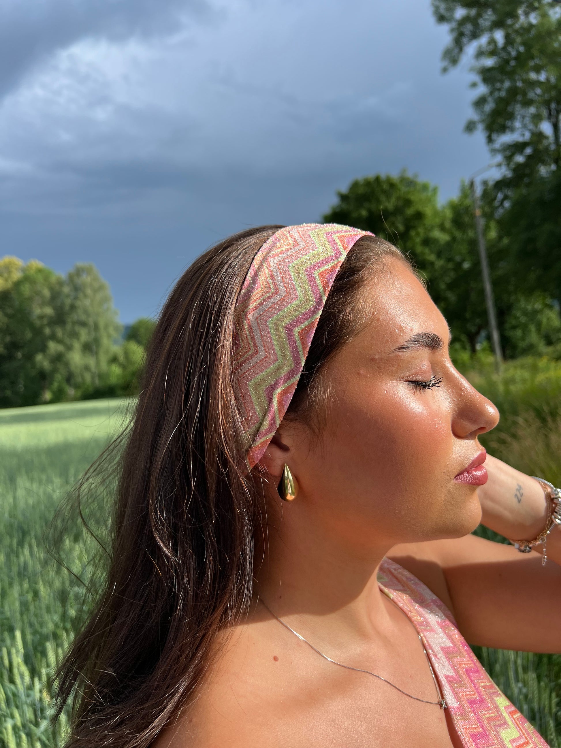 Camille hårbånd er sommerens lille statement-piece – et vakkert hårbånd i lekne nyanser av rosa, oransje og solgul, med et subtilt gullskimmer som glitrer i solen. Det unike sikksakk-mønsteret gir en fresh og trendy look, perfekt for å piffe opp både hverdags- og festantrekk.