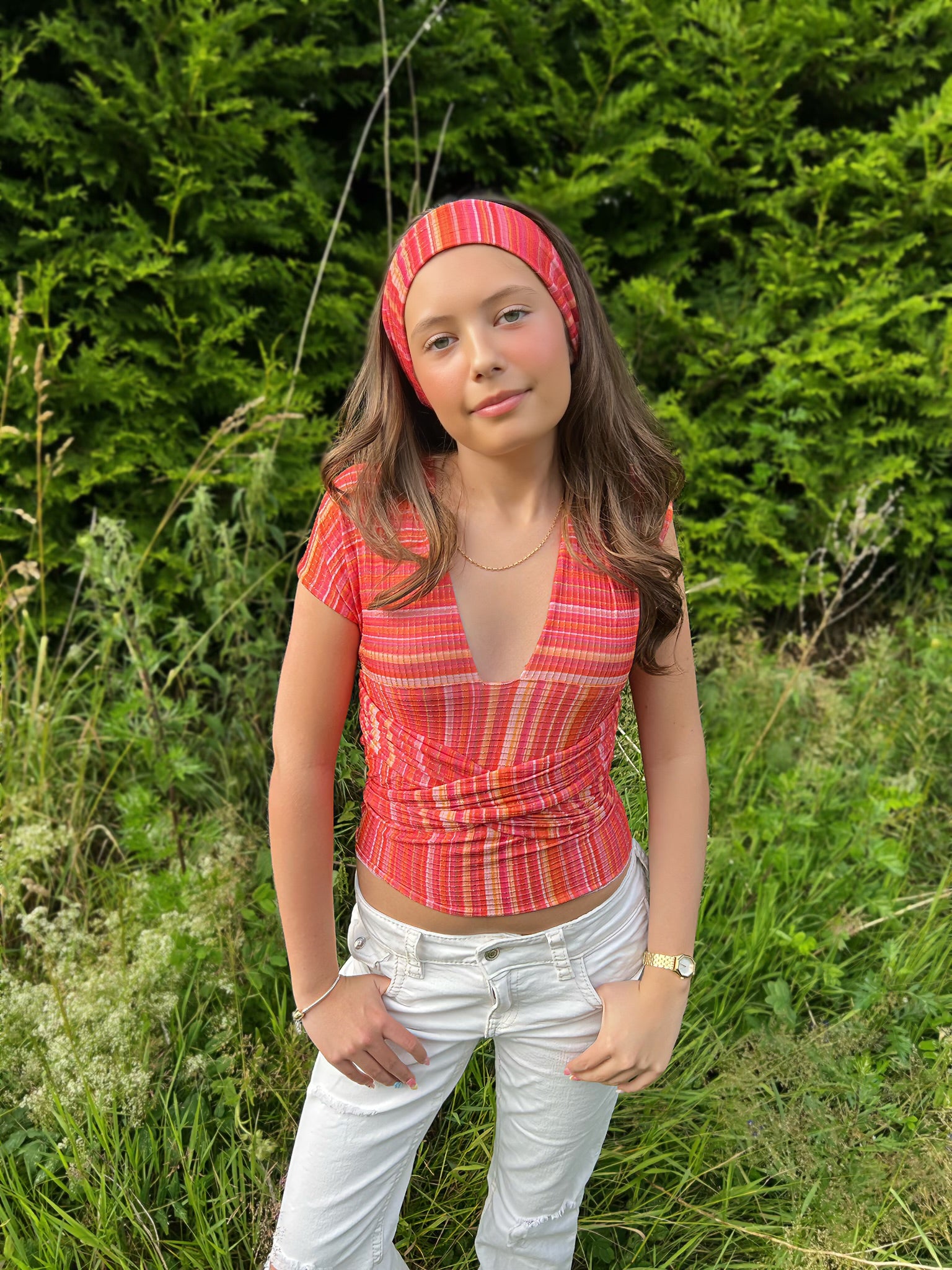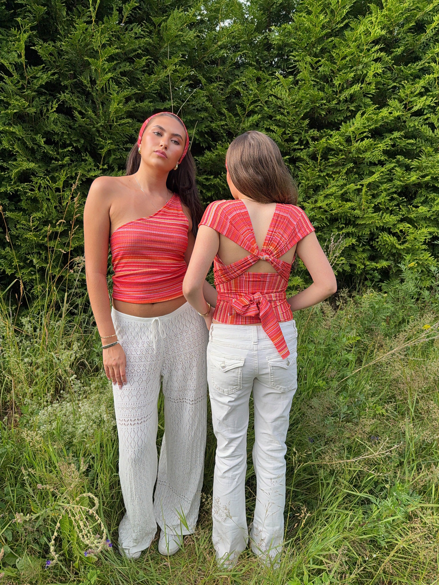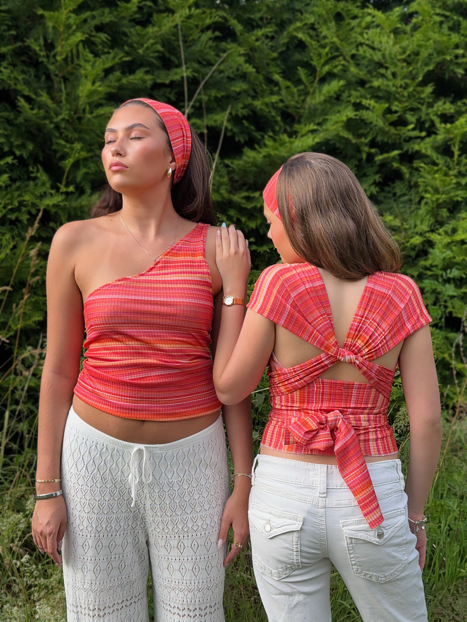Toppene er sydd i et eksklusivt stoff med glitrende gull-detaljer som fanger lyset på en nydelig måte. Hver topp er håndlaget, og det kan derfor forekomme små variasjoner og skjønnhetsfeil – det er en del av sjarmen ved håndverk. Stoffet er mykt mot huden – innsiden er glatt og fri for glitter, slik at den ikke klør eller gnisser. Perfekt for varme sommerdager eller sensitiv hud.