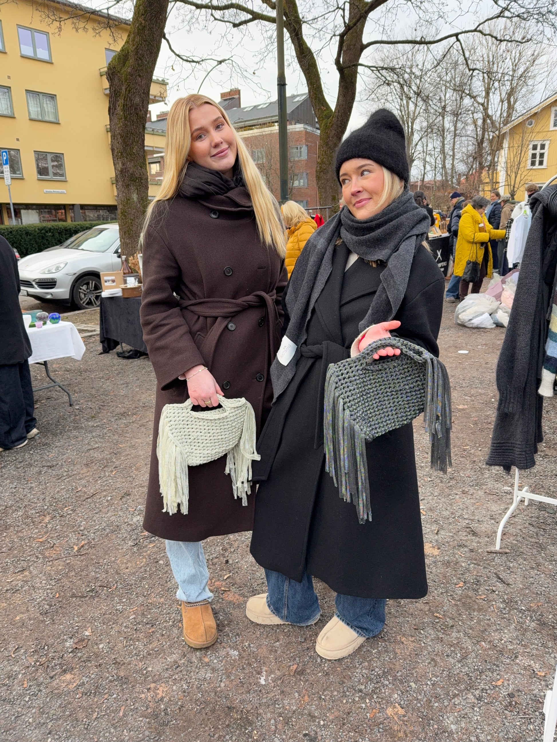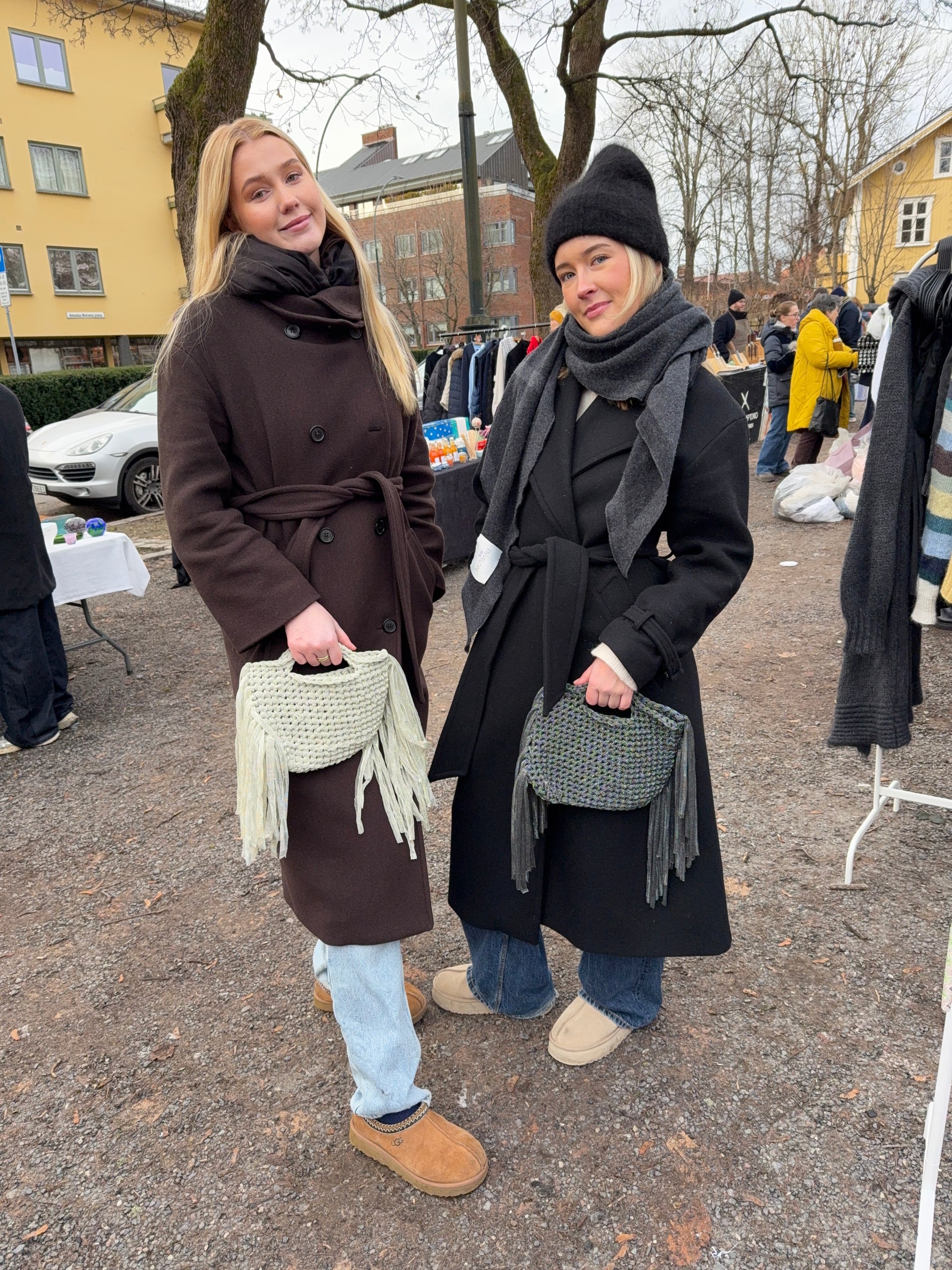 Vesken er laget i et glitrende tyllgarn fra strikkefeber. Frynsene på sidene gir den det lille ekstra, og den passer like godt til hverdags som til kveldsbruk. Den er akkurat passe stor til å romme det viktigste: mobil, nøkler, lommebok og litt til. Bæres i hånden med innebygde håndtak. Veskene og mønsteret er egendesignet av Byfrandsen.