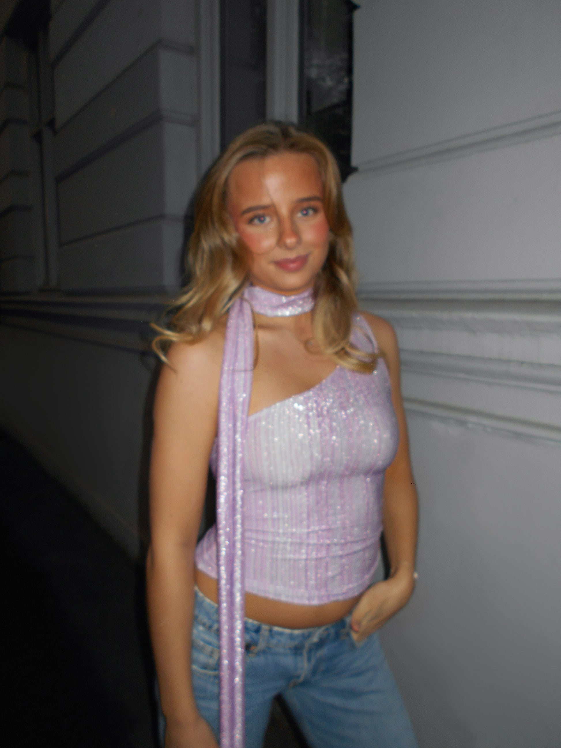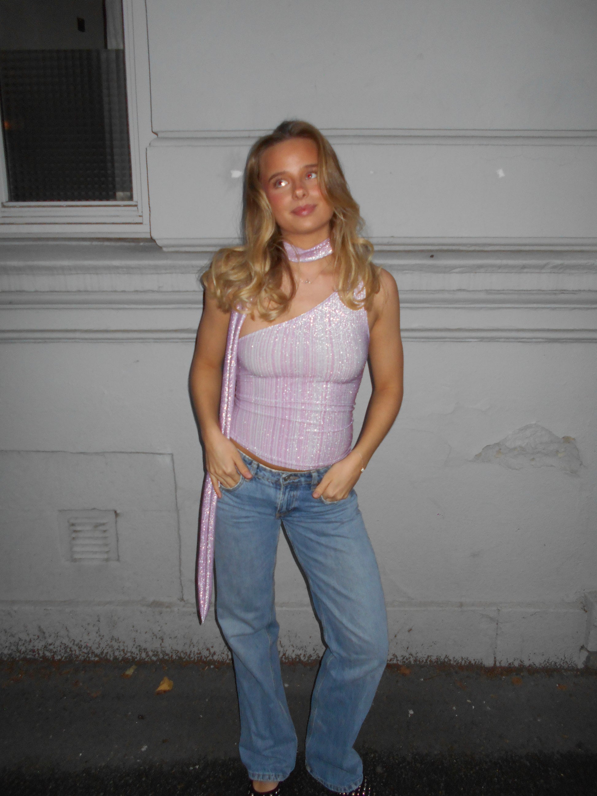 Aurora toppen er en variant av våre multiway topper, men med et fast one shoulder snitt. Toppen har et langt skjerf som følger designet som kan styles akkurat slik du ønsker. Enkel å style med både bukser og skjørt, og like fin til fest som til en mer rolig kveld. Tekstilet er egendesignet av Byfrandsen. Stoffet er flerfarget med ulike nyanser av rosa, lilla og hvite striper, med glitter som gir en utrolig vakker glans - spesielt når lyset treffer.