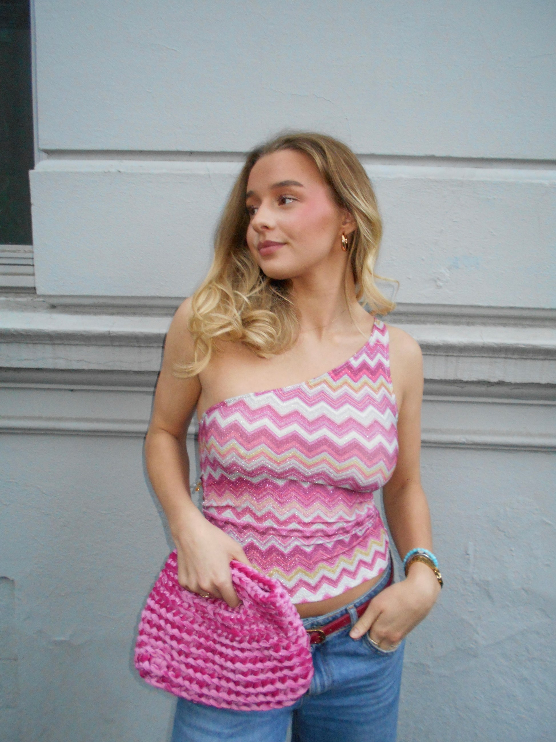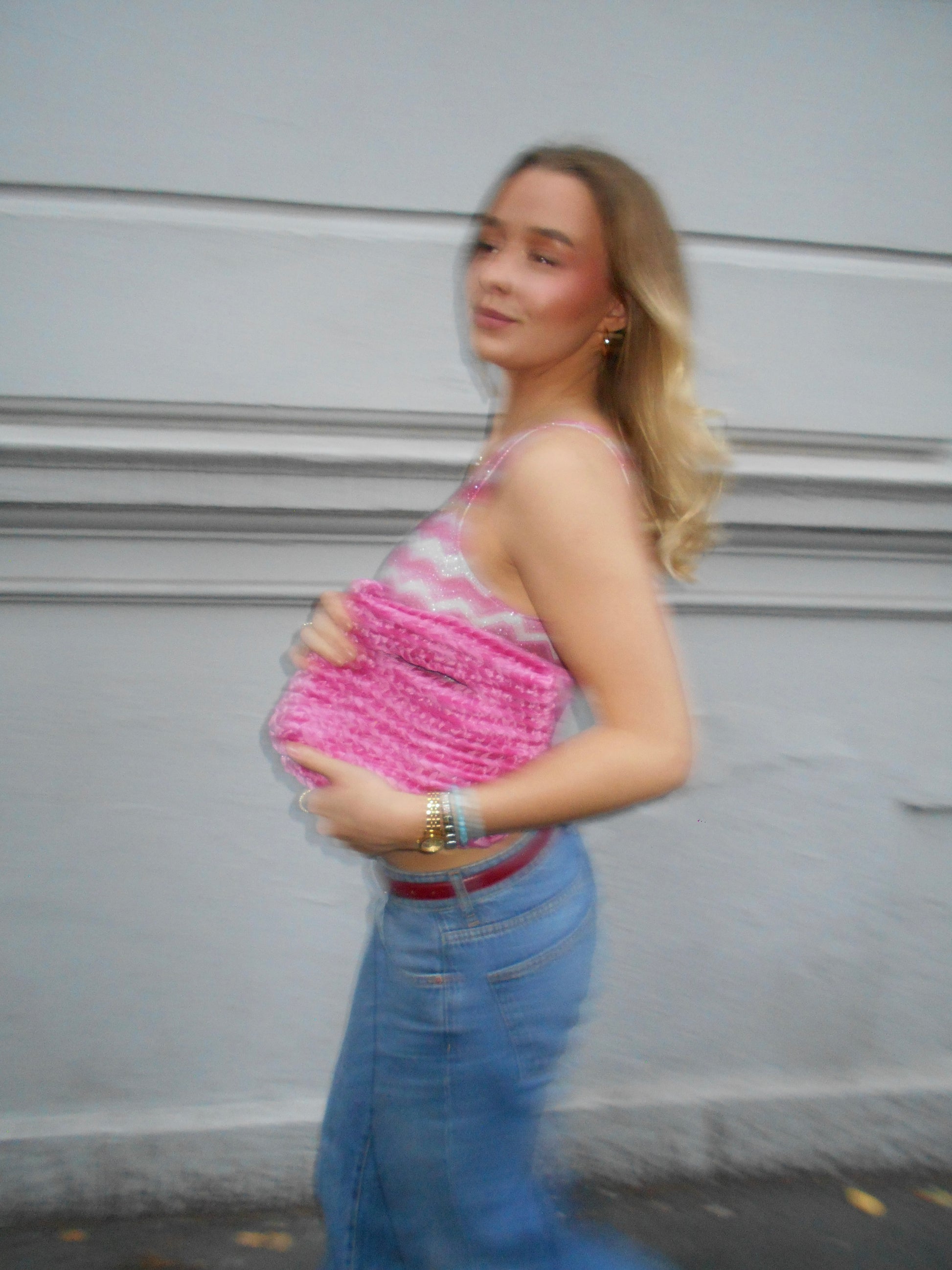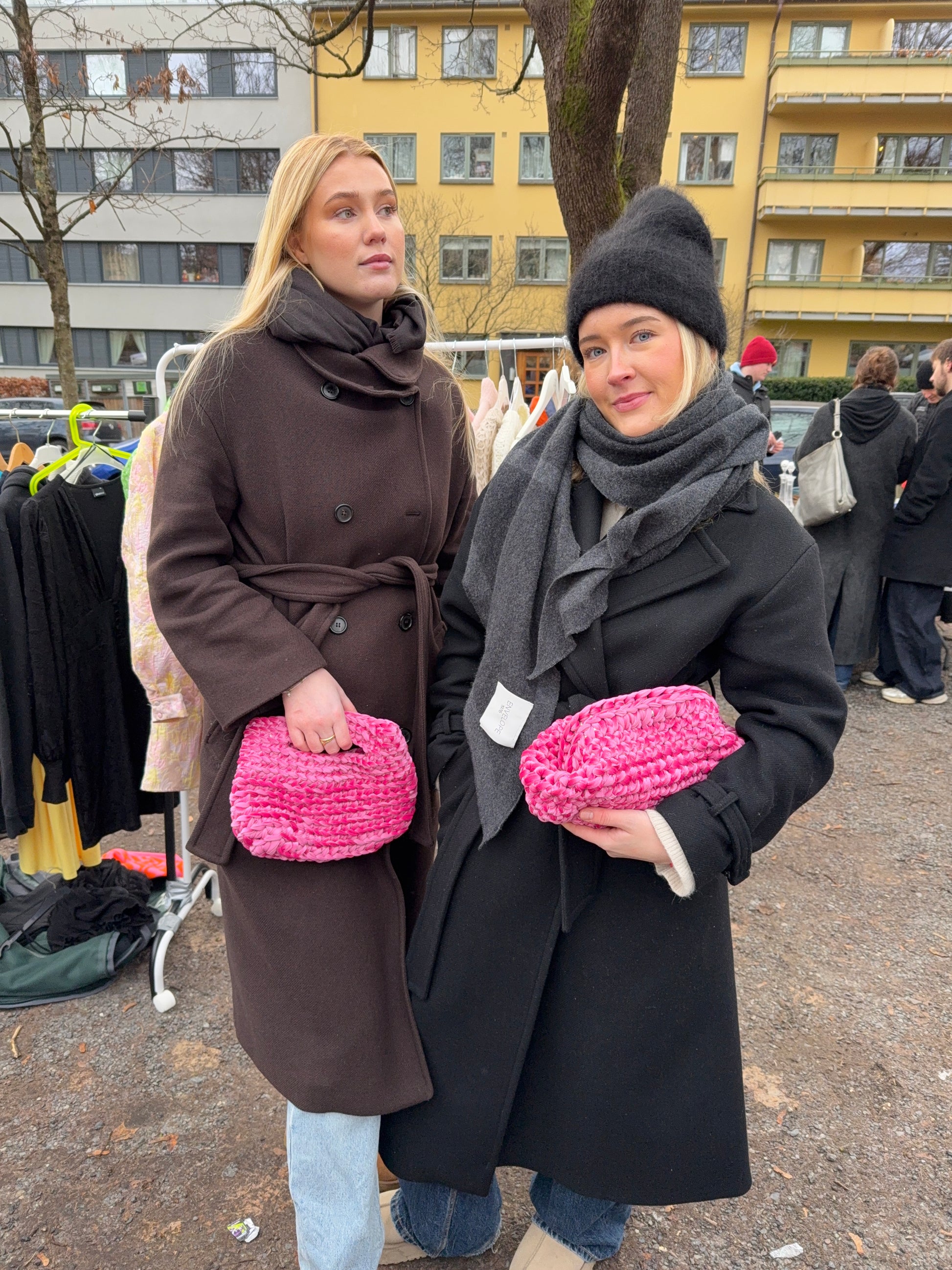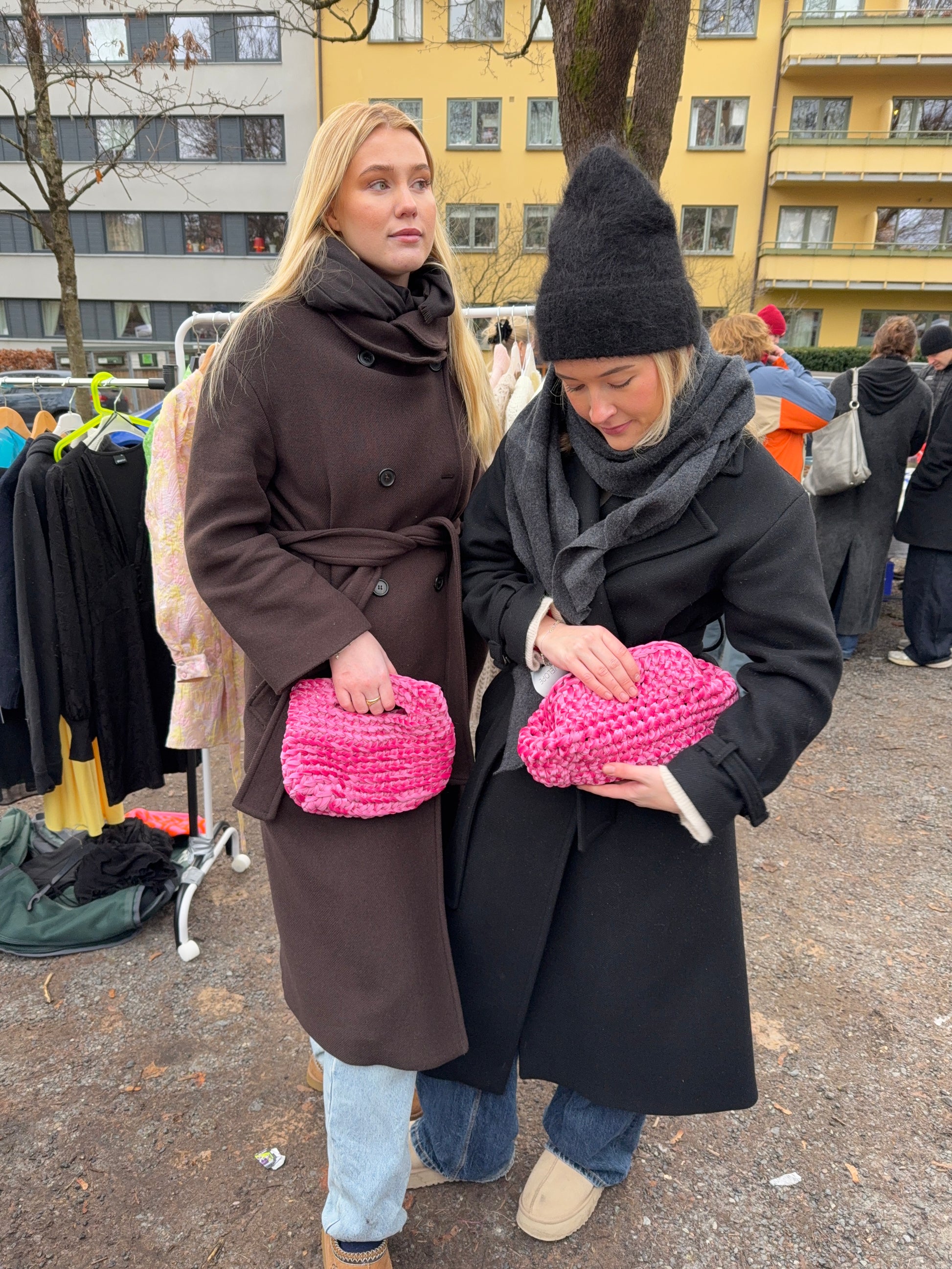 Heklet for hånd i glitrende og det populære fettuccia garnet fra Italia. Garnet er bredt og båndaktig med glitter som fanger lyset på en nydelig måte. Begge veskene har innebygd håndtak og god plass til det du trenger. Perfekt til julebord, nyttår og når du vil pynte deg litt ekstra. Vesken og fleksibel, men holder likevel formen fint. Vesken er egendesignet av Byfrandsen.