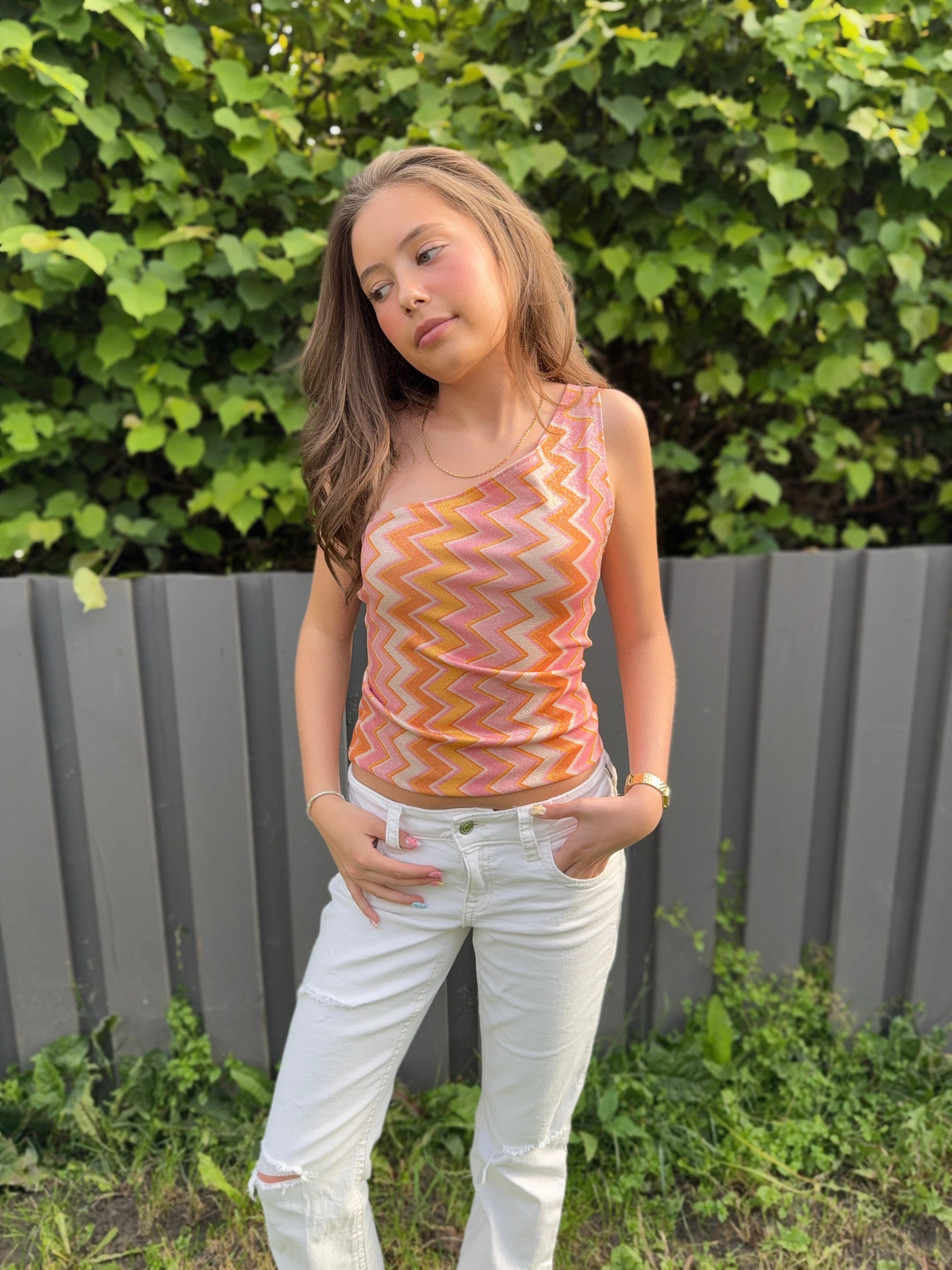 Toppene er sydd i et eksklusivt lurex-stoff med glitrende sikksakk-detaljer som fanger lyset på en nydelig måte. Hver topp er håndlaget, og det kan derfor forekomme små variasjoner og skjønnhetsfeil.