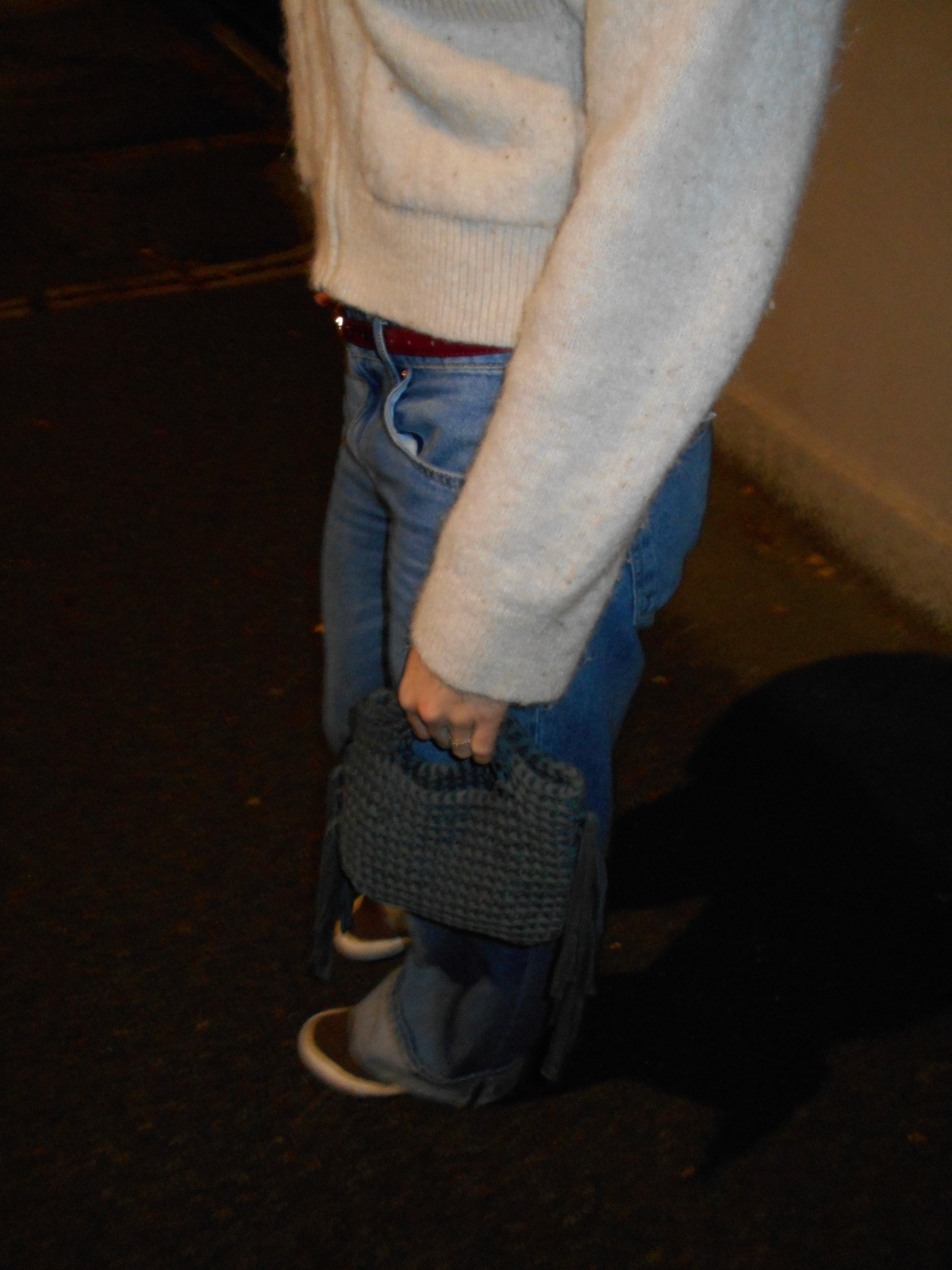 Hånd-heklet veske i mørke grå. Frynsene på sidene gir den det lille ekstra, og den passer like godt til hverdags som til kveldsbruk. Den er akkurat passe stor til å romme det viktigste: mobil, nøkler, lommebok og litt til. Bæres i hånden med innebygde håndtak. Veskene og mønstret er egendesignet av Byfrandsen.